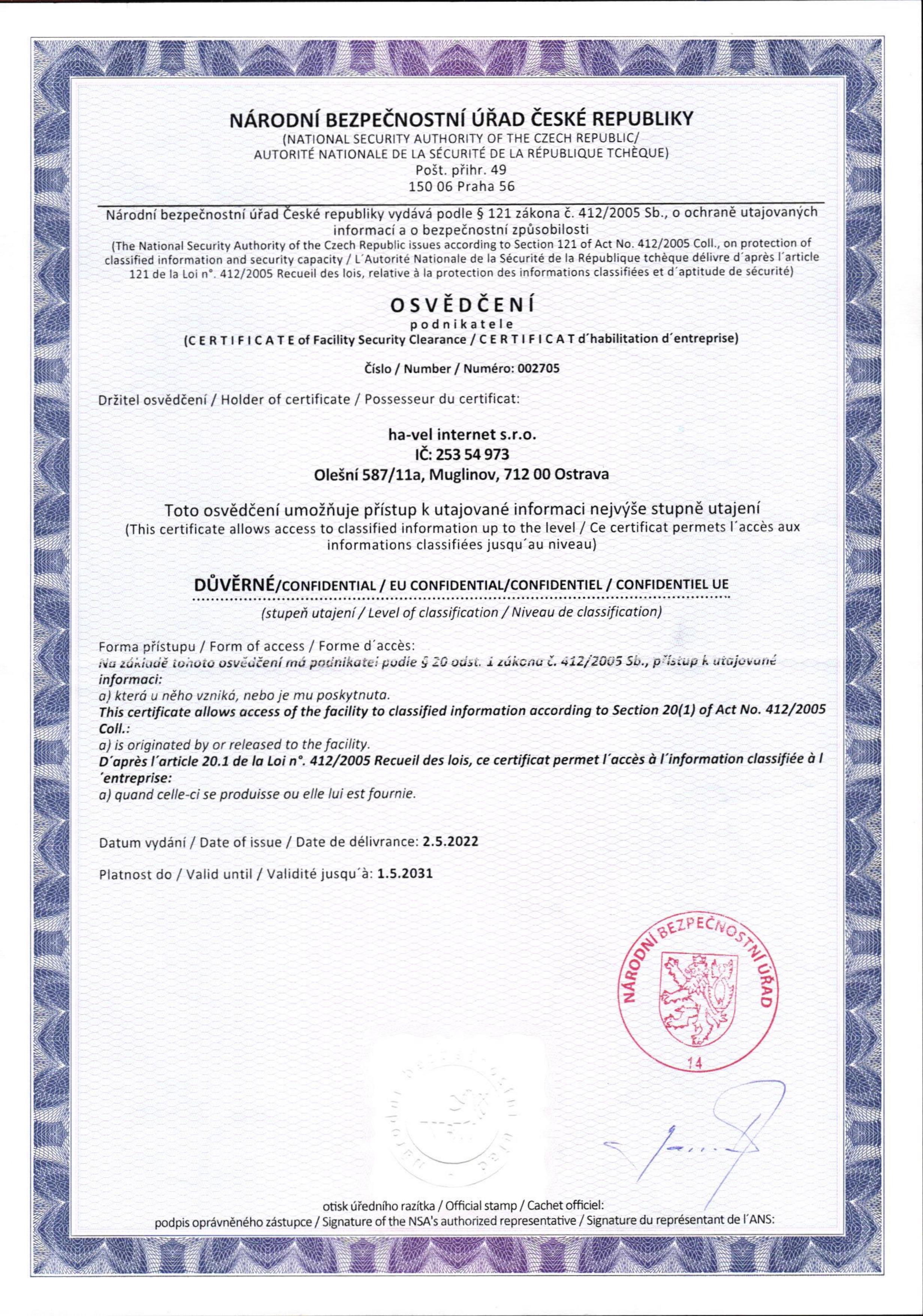 Osvědčení - Národní bezpečnostní úřad České Republiky