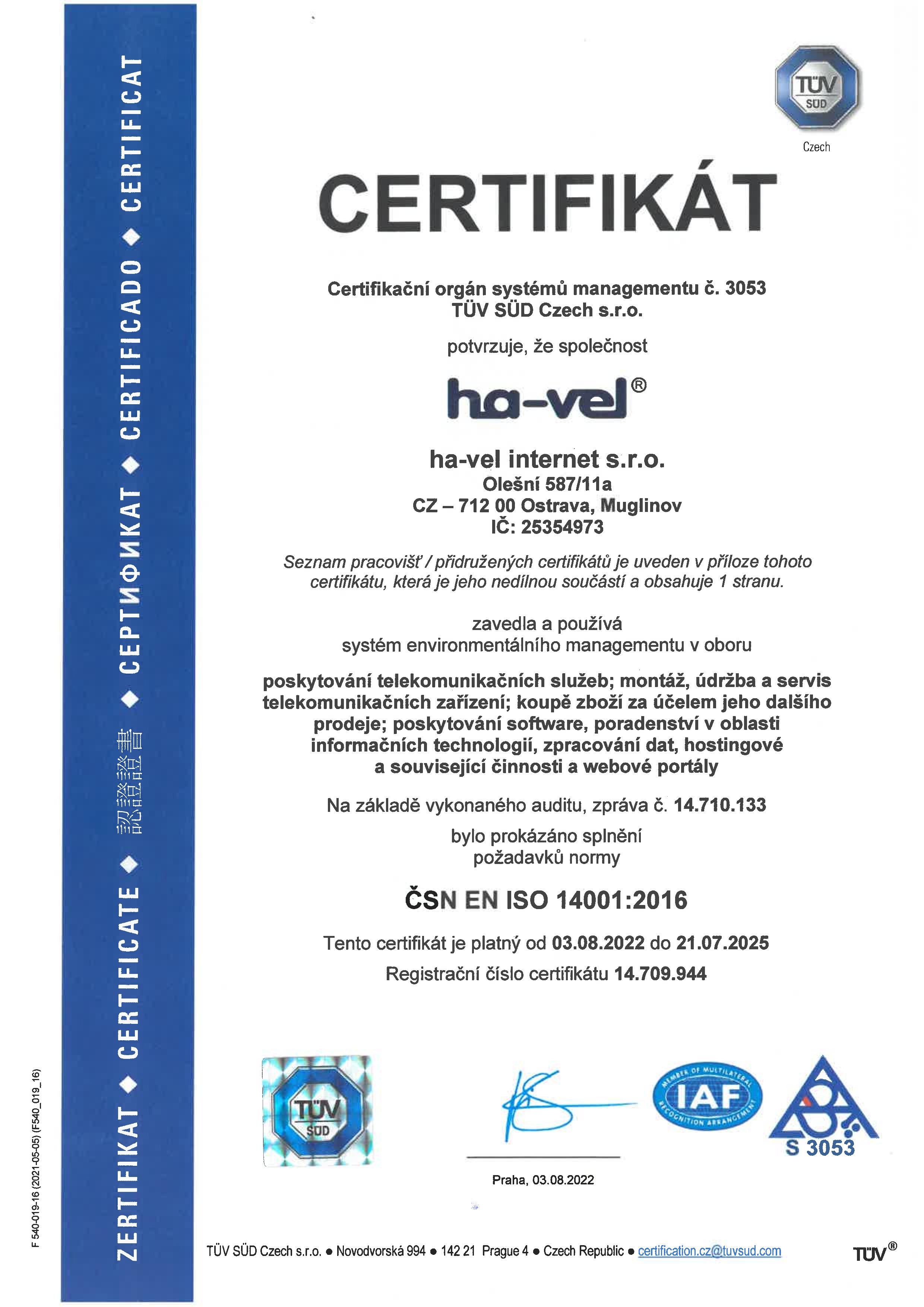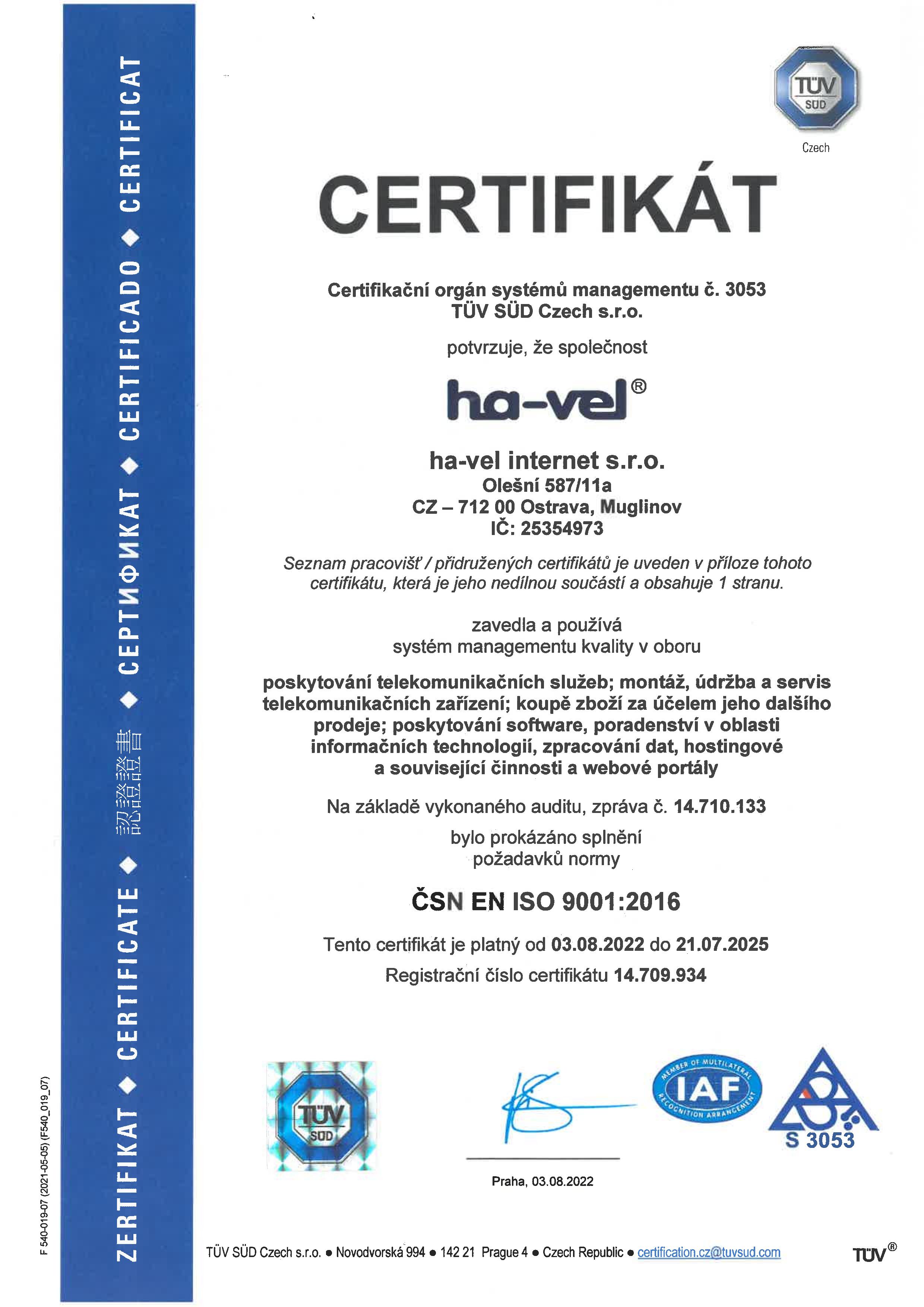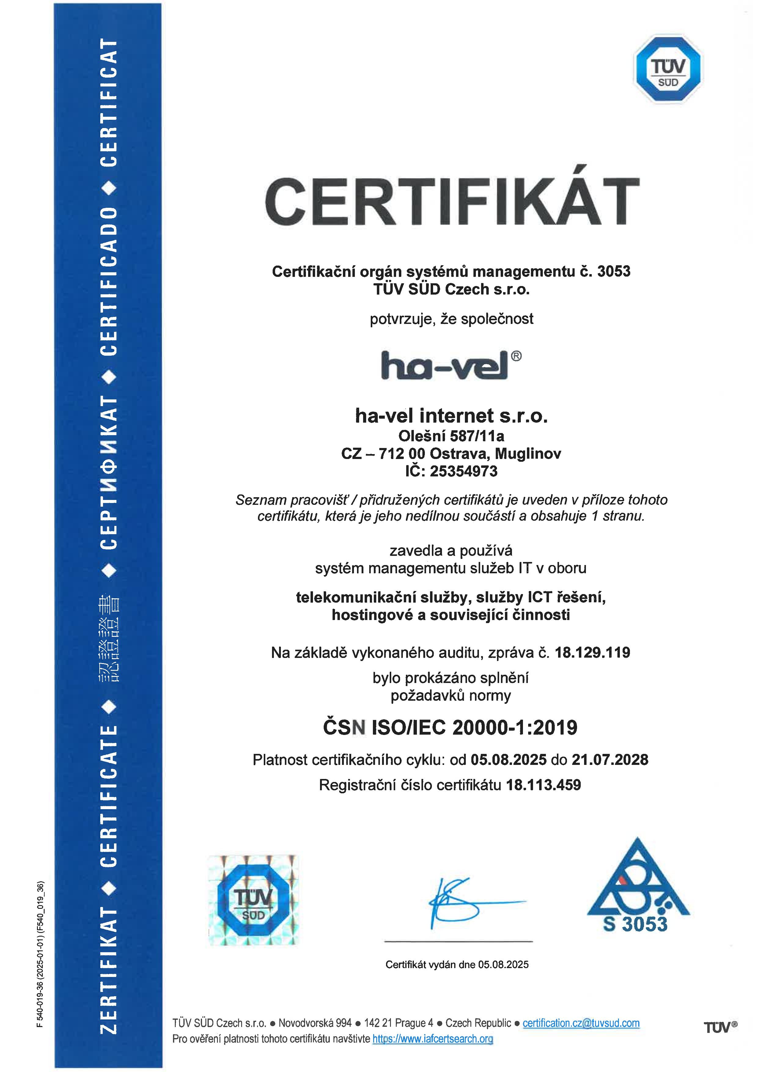 Certifikát ČSN ISO/IEC 20000-1:2019