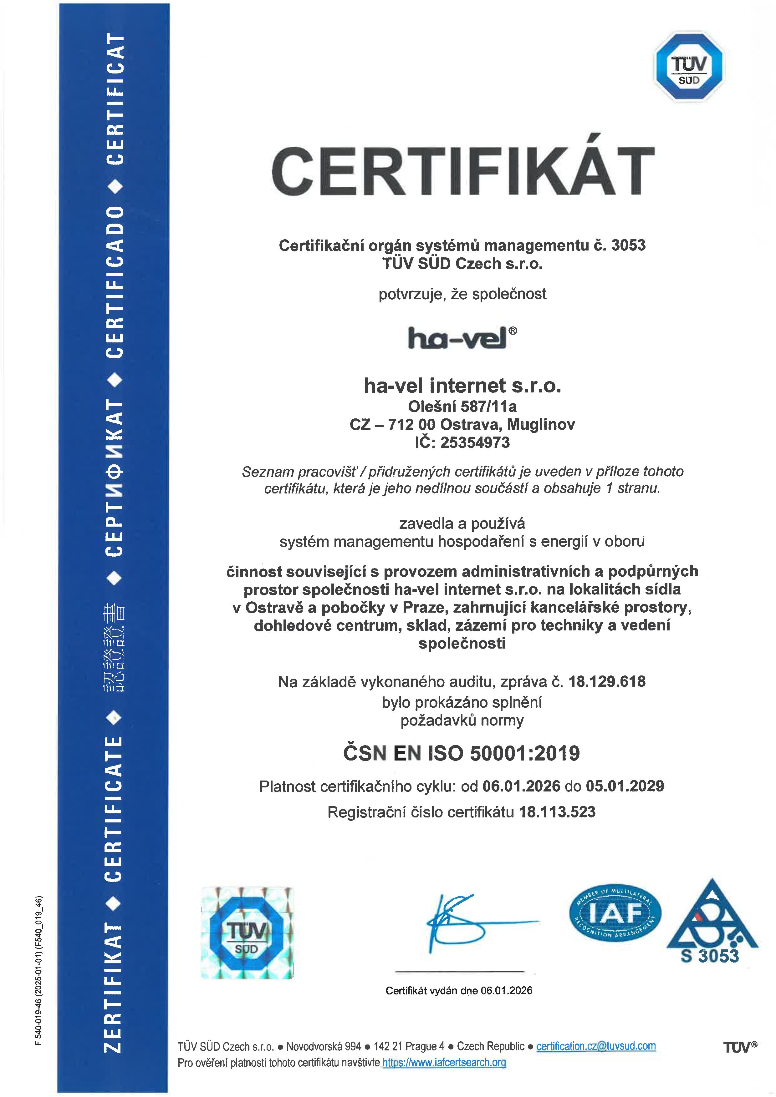 Certifikát ČSN ISO 50001:2019