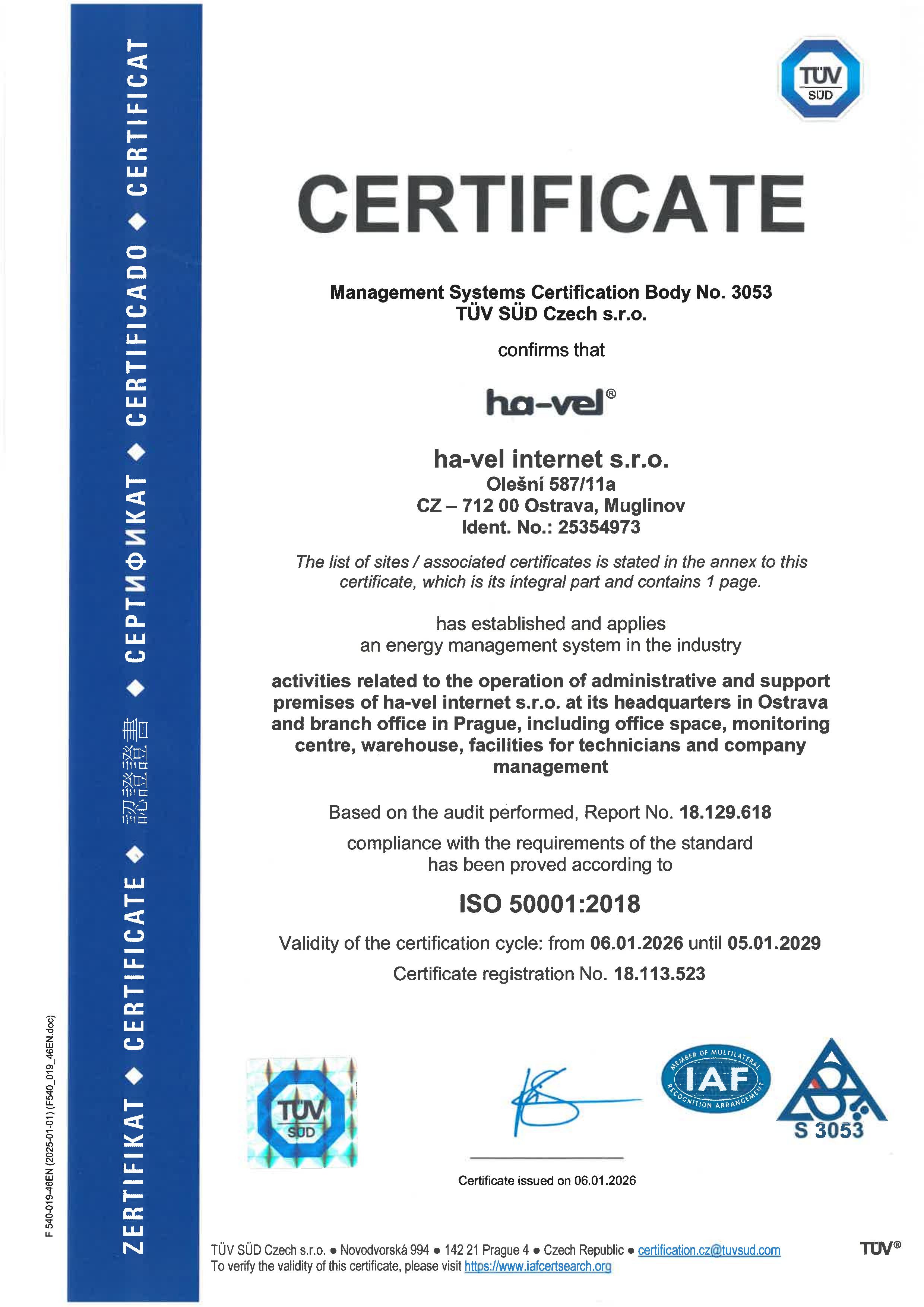 Certificate ČSN EN ISO 50001:2018